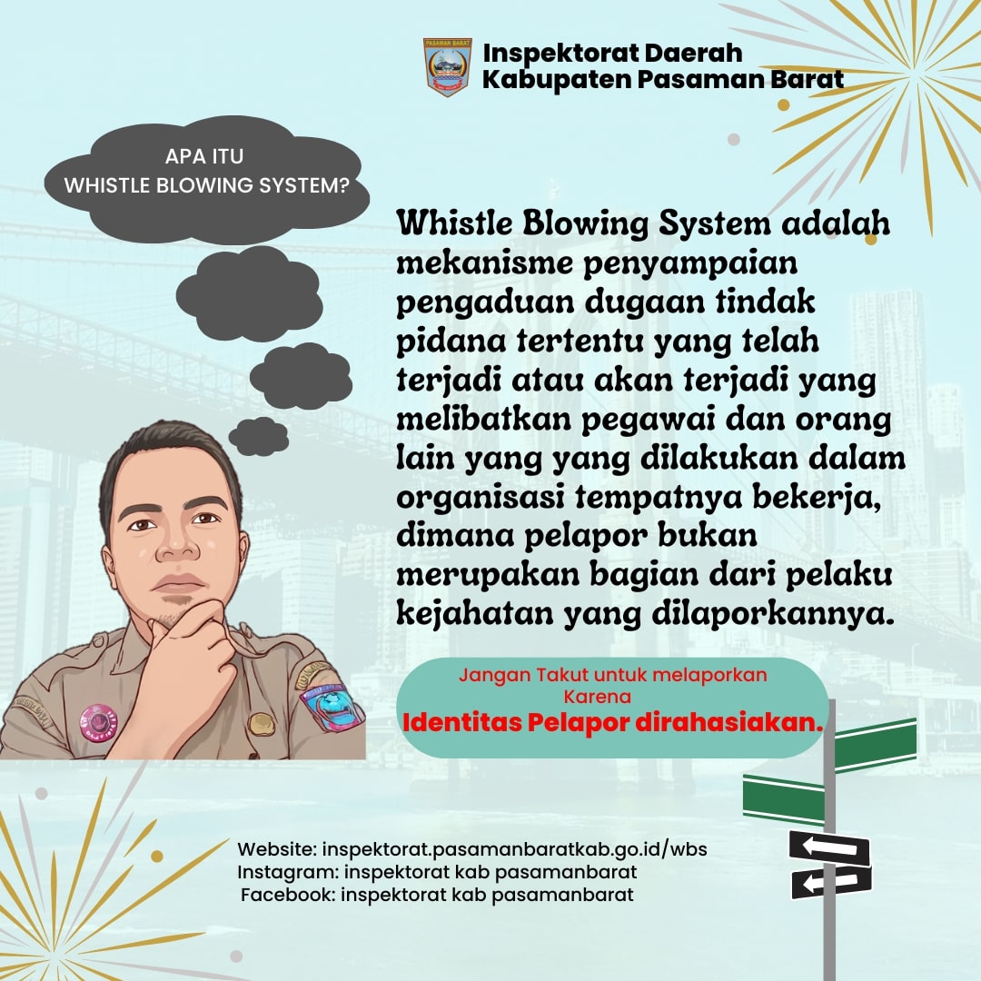 Pemerintah Kabupaten Pasaman barat melalui Inspektorat memiliki aplikasi yang bernama Whistleblowing System (WBS) yang berfungsi untuk melaporkan atau menginformasikan suatu perbuatan yang terindikasi pelanggaran di lingkungan Pemerintah Kabupaten Pasaman Barat.